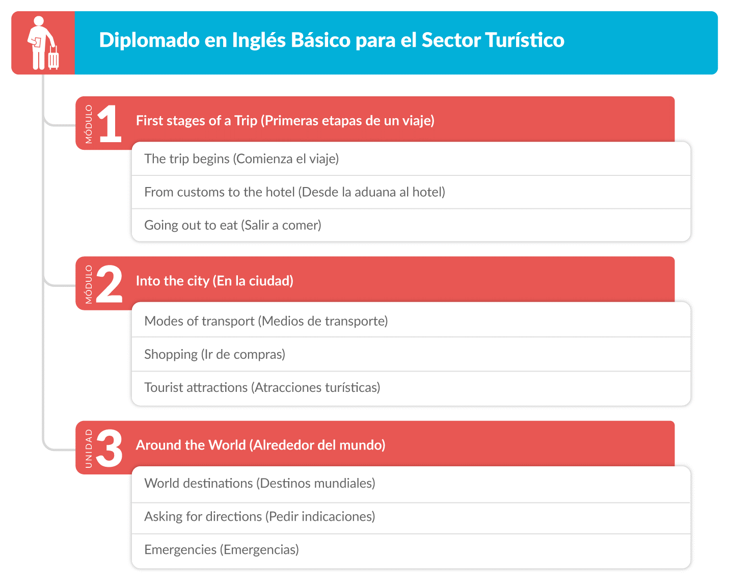 Exploraras diferentes destinos y atractivos turísticos alrededor del mundo, junto con los gentilicios, monedas e idiomas de algunos países. Asimismo, aprenderás a solicitar orientación, ayuda médica y apoyo de la policía.