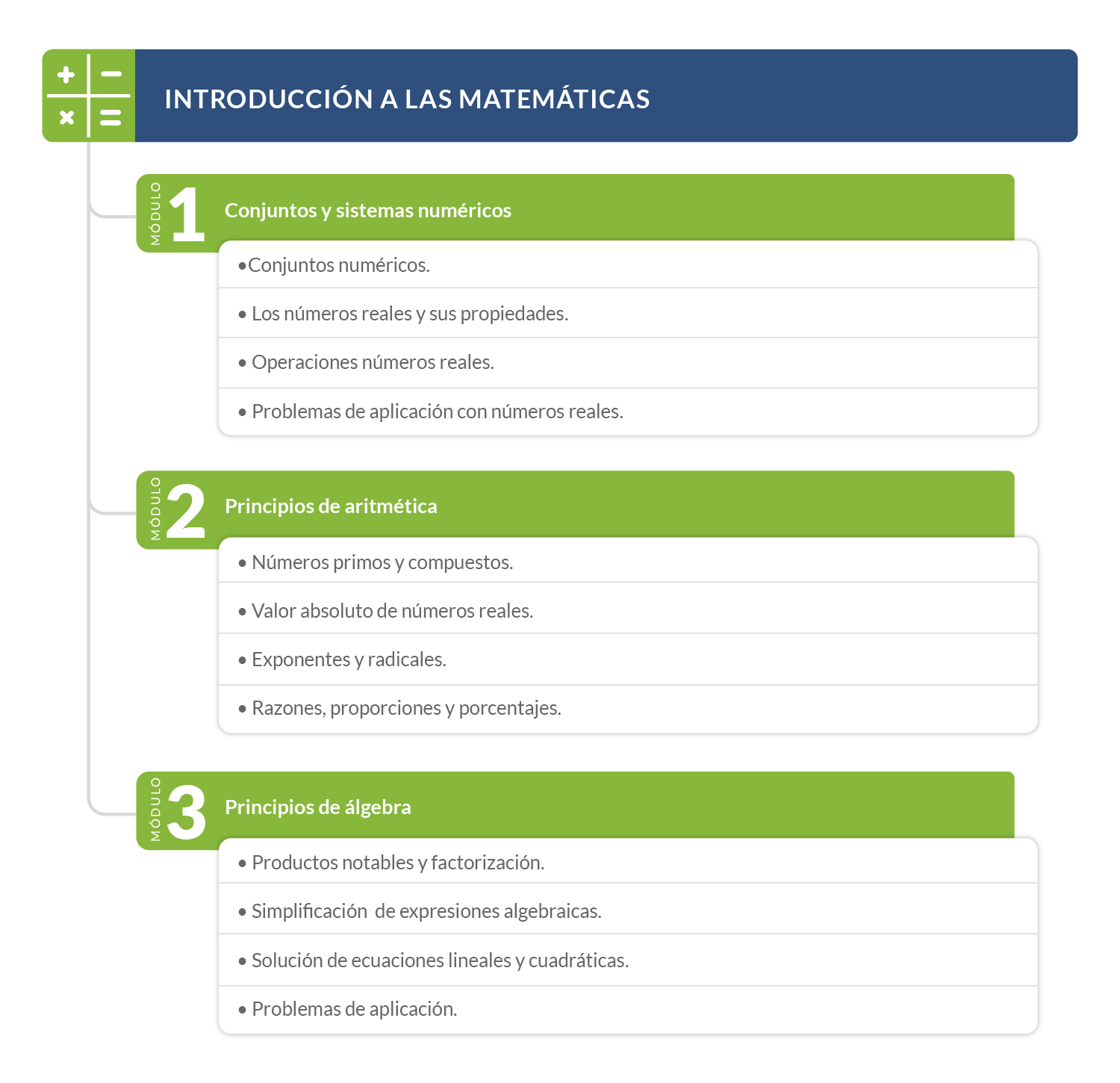El curso de introducción a las matemáticas explora los conceptos básicos de aritmética y álgebra para el fortalecimiento y la apropiación de conocimientos en el área de matemáticas, identificando los distintos conjuntos numéricos y las operaciones entre sus elementos.