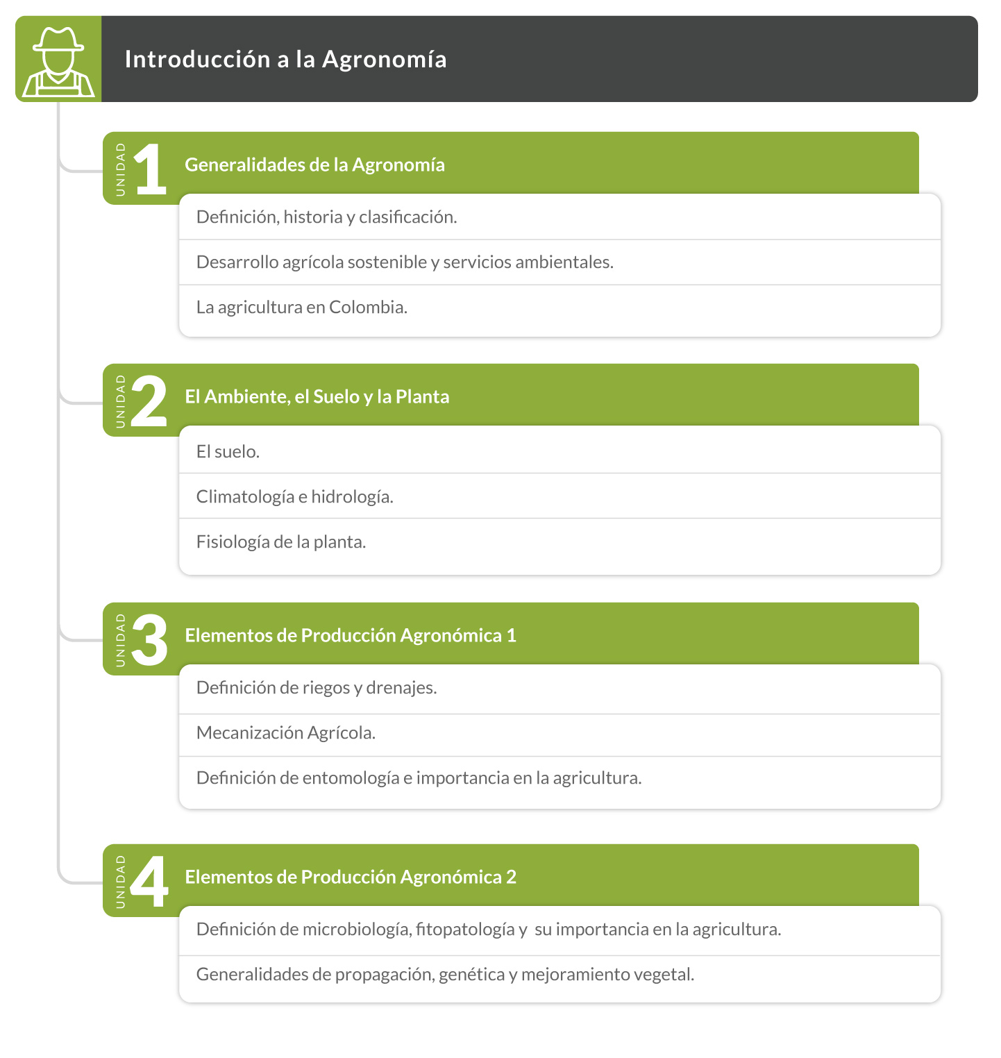 En este curso comprenderás de manera general el desarrollo global de la agronomía, identificando los retos, oportunidades y responsabilidades que debe enfrentar la agronomía. conocerás la importancia del suelo, en la actividad agrícola, para aplicar conocimientos generales de suelo, clima y agua en el desarrollo de actividades en el campo de la agricultura.