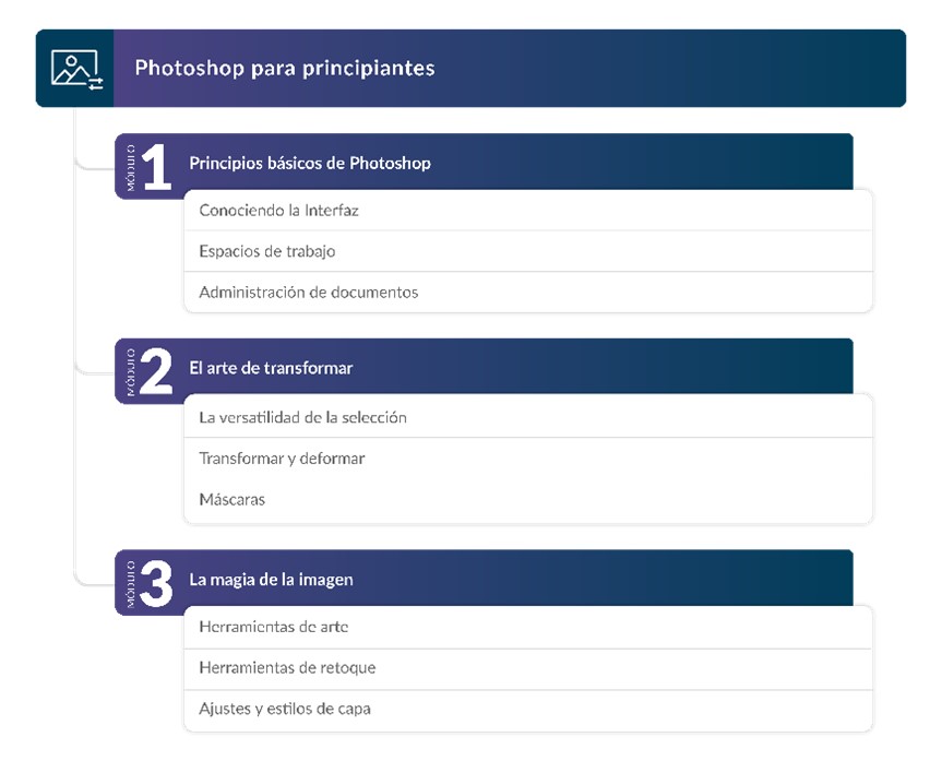 En este curso identificarás la interfaz y los diferentes espacios de trabajo en Adobe Photoshop, diseño, una composición por medio de herramientas básicas de Adobe Photoshop, realizando mejoras estéticas a las propiedades de una imagen en Adobe Photoshop.